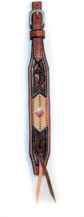 Hoofdstel Two-Tone Browband met Flower Tooling en Rawhide op de frontriem en cheeks (bakstukken). Bakstukken zijn 3,5 cm breed.